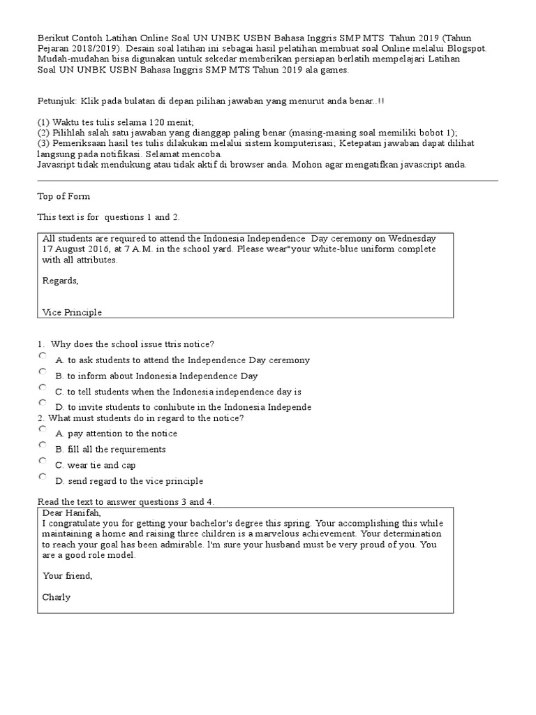 Soal hots unbk matematika kelas ix smp 4752 x; Soal hots unbk sma ipa bahasa indonesia kelas xii sma 9464 x; Mar 22 2021 soal dan pembahasan un tahun 2018 bahasa indonesia smp mts zuhri indonesia. Latihan unbk smp bahasa inggris,,, hal ini merupakan sebuah mata pelajaran yang sangat populer di kalangan dunia karena sering di gunakan pada media pembelajaran studi dengan percakapan bahasa internasional untuk berinteraksi dengan baik dan benar, kami materibelajar.co.id memberikan soal latihan unbk tingkat smp soal pilihan ganda. Passing grade kelulusan simulasi cbt. Soal hots unbk matematika kelas ix smp 4731 x; Berikut ini admin sharingkan 2 (dua) paket, yaitu paket a dan paket b, diharapkan dapat menjadi semakin variasi untuk mempersiapkan un unbk smp dan ujian sekolah tentunya. Beberapa waktu yang lalu, admin rukim.id baru bisa menyediakan soal ucun dki 2019 ipa dan matematika, kali ini saya share mapel bahasa inggris dua paket soal. Contoh soal simulasi usbn unbk bahasa inggris smp versi 6 lengkap dengan jawaban. Berikut contoh soal latihan un dan unbk bahasa inggris smp tahun 2020 tahun pelajaran 2019 2020 desain soal latihan ini sebagai hasil pelatihan membuat soal online melalui blogspot. Nah, pada kesempatan kali ini blog tomatalikuang.com akan berbagi latihan soal un smp tahun 2020 mata pelajaran bahasa inggris untuk dijadikan sebagai prediksi soal ujian nasional tingkat smp tahun 2020. Seluruh soal harus dijawab dalam waktu 30 menit. Soal hots unbk bahasa inggris kelas ix smp 10238 x;